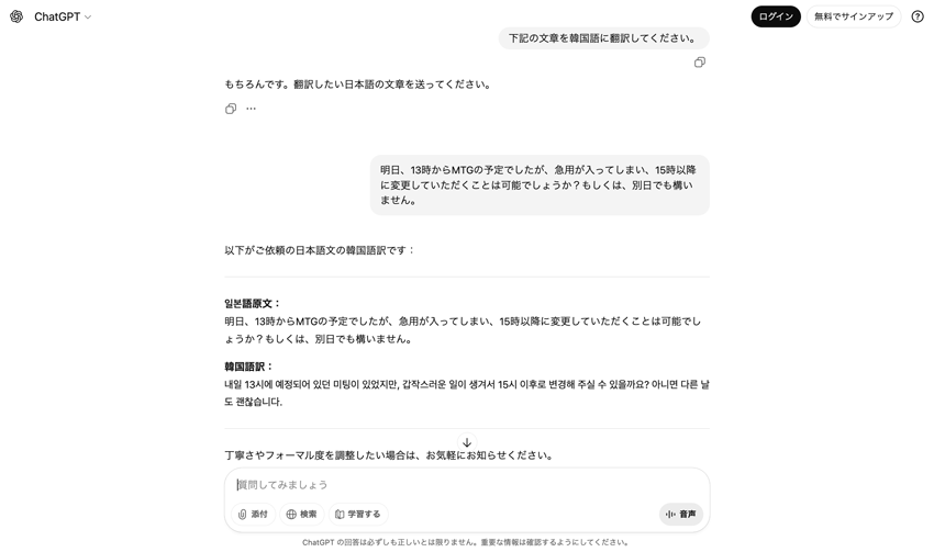 たとえば、下記は、「韓国語に翻訳して」とChatGPTに依頼した際の回答です。