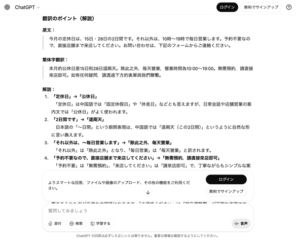 気になった人は、一度、ChatGPTに実際に翻訳を依頼してみてください。
